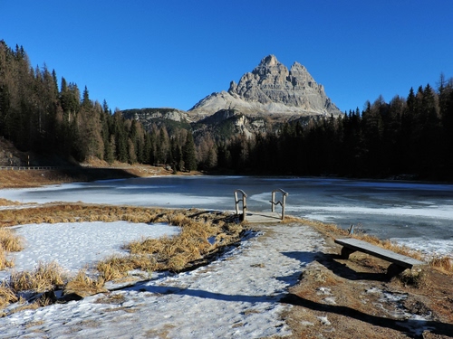 Bella luce, bel paesaggio, belli la panchina e il ponticello di legno. |