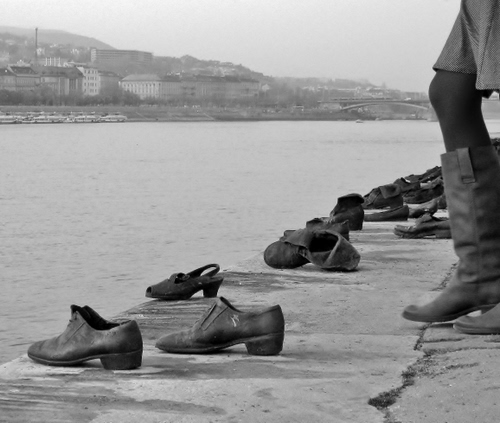 da Wikipedia: Le scarpe sulle rive del Danubio è un'opera del regista Can Togay, realizzato insieme allo scultore Gyula Pauer, che si trova a Budapest. L'opera raffigura delle scarpe poste sulla sponda del Danubio sul lato di Pest e ricorda un massacro di cittadini ebrei compiuto dai miliziani del Partito delle Croci Frecciate durante la seconda guerra mondiale. Così si chiamava la milizia che collaborò con i nazisti nella deportazione e sterminio di migliaia di ebrei ungheresi. Dopo averli imprigionati nelle loro stesse case all'interno del ghetto, i miliziani decisero di assassinare le proprie vittime in città. Gli ebrei venivano trascinati lungo il fiume Danubio, legati a gruppi di tre e uccisi con un colpo alla nuca; i loro cadaveri venivano gettati nel fiume.