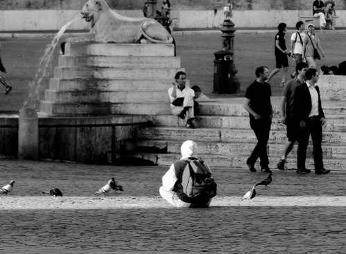 Foto dell'autore ema candidata al contest fotografico bianconero su Dizy. Data inserimento: martedì 9 luglio 2013. Titolo: a piazza del Popolo con piccioni e colombe