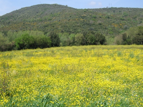 Una tavolozza cromatica fatta dei colori con cui si esprime la primavera: come su una tela verde, punti gialli creano campiture più dense in alcuni punti e più rade altrove. Il pattern visivo è composto dal piano del campo verde spruzzato di fiori gialli, lo sfondo della collina mediata da una serie di alberi in fila che campionano varie tonalità di verde. Un immagine degna di un quadro impressionista, dove la terra e la natura sono gli unici protagonisti.
