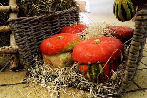Tag: zucche, paglia, cesto, rosso, vimini, arancione, verde, giallo, ortaggi, zucca, scala, verdura, legno, arancio, pavimento.