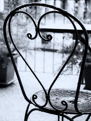 Tag: ferro, sedia, gocce, pioggia, cuore, vasi, piante, bianconero, terrazzo, volute, acqua, schienale, ringhiera.