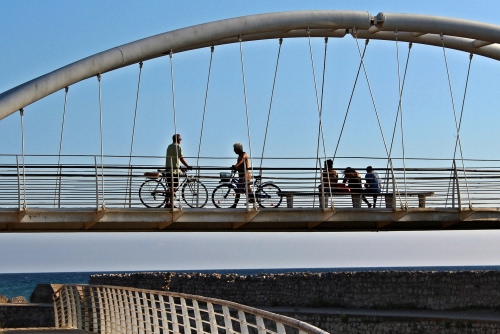 Tag: ponte, biciclette, mare, cielo, persone, panchina, passanti, tiranti, arco, muro, panchine, struttura, ringhiera, orizzonte, fili.