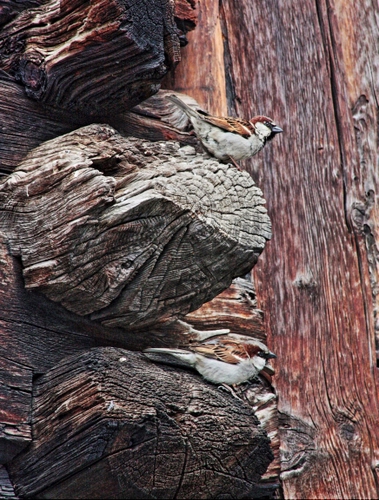 passeri mimetizzati tra le travi di una baita di Livigno