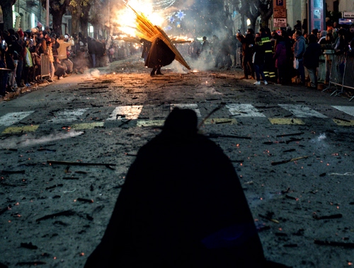 Mi spiace doverti deludere ma non c'è nessuna costruzione! Se osservi bene la foto vedrai che quella in primo piano è la figura di uno dei partecipanti alla ndocciata di Agnone, con la cappa nera addosso, che sta fotografando ed io ero sopra, in piedi, così ho ripreso la sua figura. |