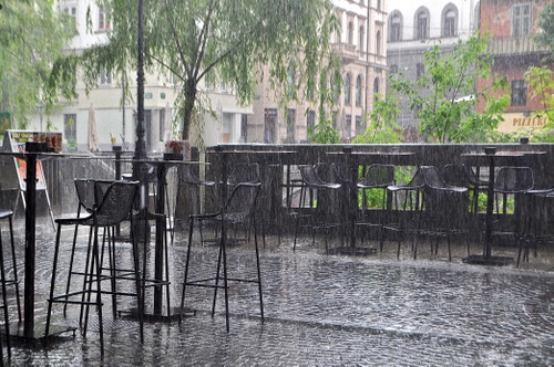 Tag: alberi, pioggia, sedie, tavolini, finestre, case, palazzi, tavoli, terrazza, albero, bar, acqua.