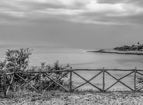 Tag: staccionata, cielo, mare, nuvole, bianconero, piante, grigio, acqua, legno, lago, panorama, paesaggio, affaccio, costa.