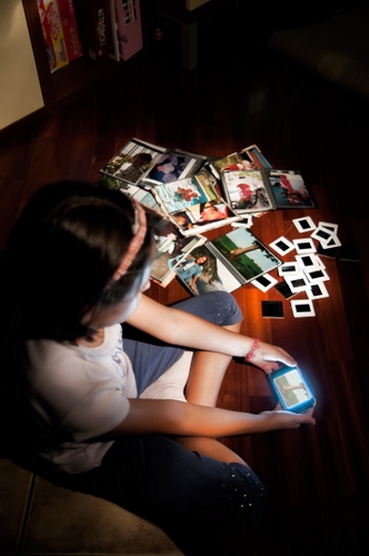 In questa immagine ho cercato di rappresentare il cambiamento della fotografia, in particolare quali cambiamenti hanno subito nel tempo i supporti fotografici. Pellicole, diapositive, fotografie stampate fino ad arrivare alla moderna visualizzazione sugli smartphone. E' difficile spiegare ai bambini com'era la fotografia delle pellicole, della camera oscura, delle foto che "non si vedevano subito" ma bisognava farle sviluppare. Mi sono immaginato una bambina che sfogliando le immagini da un telefonino pensa a come venivano esposte le immagini qualche tempo fa... Ho usato la tecnica del light painting con una normalissima torcia.