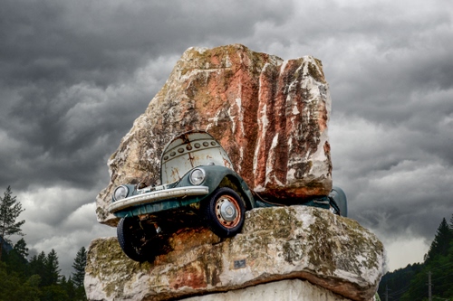 L'installazione qui raffigurata è un'opera di tale artista Antonio Paradiso, è intitolata Mausoleo ad Icaro, ed è stata realizzata con massi di pietra di Trani e maggiolino sia a Molfetta che a Matera. I massi ed il maggiolino sono diversi nelle due installazioni ma l'idea e l'autore è lo stesso. Per info digitare Mausoleo ad Icaro su google. |