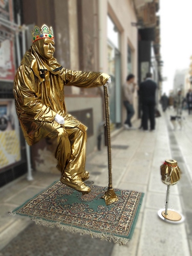 interessante l'idea di rendere tutto sfocato tranne l'artista di strada e il tappeto, l'immagine risulta molto gradevole |
