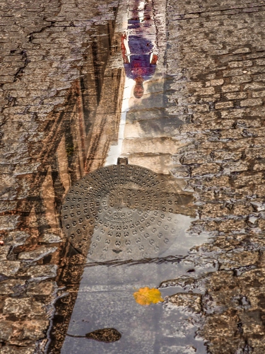 Tag: riflesso, tombino, pozzanghera, acqua, selciato, uomo, strada, lampione, foglie, persona, giallo, ragazzo, riflessi.
