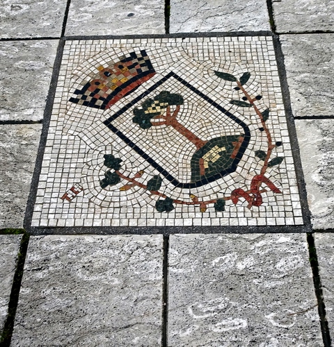 Tag: stemma, corona, mosaico, albero, pavimento, quadrati, pietra, piastrelle, grigio, mattonelle, pianta, foglie, tessere, pavimentazione, rami.
