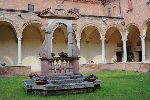 Ferrara - Chiesa di San Giorgio. "Si tratta del tempio di origini più antiche di tutta la città. Il marchese Nicolò III d'Este la affidò ai monaci Olivetani, presenti ancora oggi, e nel XV sec. l'intero complesso fu rimaneggiato per adattarlo alle esigenze conventuali. Principale artefice dei lavori fu Biagio Rossetti al quale si deve la torre campanaria, costituita da quattro parallelepipedi in laterizio, rafforzati agli angoli da paraste e divisi da fasce decorative in cotto. A sinistra della chiesa, si trova l'entrata al chiostro abbellito al centro da un grande pozzo in marmo con stemma olivetano." Da Ferrara Terra e Acqua