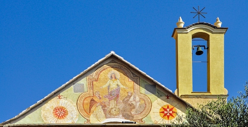Tag: campanile, vela, chiesa, campana, triangolo, affresco, cielo, azzurro, verde, timpano, tetto, dipinto, giallo, rami.