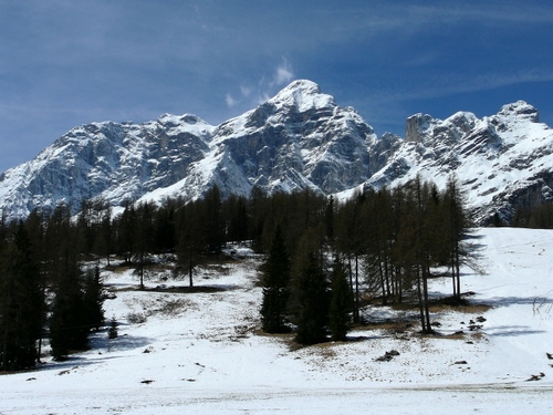 Tag: alberi, neve, cielo, montagna, inverno, bianco, azzurro, montagne, cime, rocce, abeti, bosco, roccia, paesaggio.