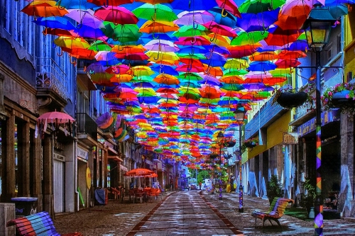 Strada con tetto di ombrelli