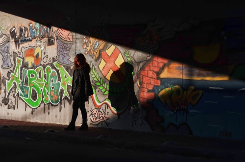Tag: murales, ombre, donna, verde, ombra, nero, rosso, colori, scritte, graffiti, muro, luce, controluce, croce, murale.