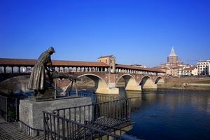 pavia il ponte coperto sul ticino e la statua della lavandaia
