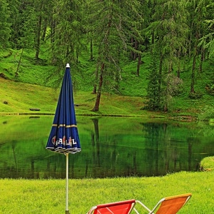 Ombrello sulla riva di laghetto alpino
