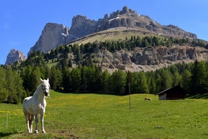 Molto bello il cavallo bianco in contrasto col verde dei prati