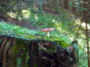 Mi piace il fungo sul ceppo d'albero con il bosco sullo sfondo.