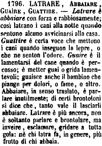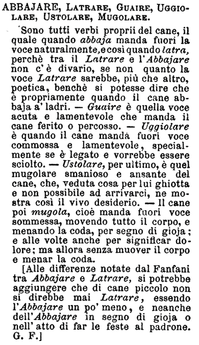 Abbajare, Latrare, Guaire, Uggiolare, Ustolare, Mugolare - Sono tutti verbi proprii del cane, il quale quando abbaja manda fuori la voce naturalmente, e così quando latra, perché tra il Latrare e l'Abbajare non c'è divario, se non quanto la voce Latrare sarebbe, più che altro, poetica, benché si potesse dire che è propriamente quando il cane abbaja a' ladri. - Guaire è quella voce acuta e lamentevole che manda il cane ferito o percosso. - Uggiolare è quando il cane manda fuori voce commossa e lamentevole, specialmente se è legato e vorrebbe essere sciolto. - Ustolare, per ultimo, è quel mugolare smanioso e ansante del cane, che, veduta cosa per lui ghiotta e non possibile ad arrivarci, ne mostra così il vivo desiderio. - Il cane poi mugola, cioè manda fuori voce sommessa, movendo tutto il corpo, e menando la coda, per segno di gioja; e alle volte anche per significar dolore; ma allora senza muover il corpo e menar la coda.