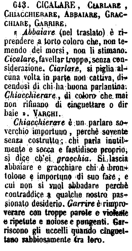 Cicalare, Ciarlare, Chiacchierare, Abbaiare, Gracchiare, Garrire - « Abbaiare (nel traslato) è riprendere a torto coloro che, non temendo dei morsi, non li stimano. Cicalare, favellar troppo, senza considerazione. Ciarlare, si piglia alcuna volta in parte non cattiva, dicendosi di chi ha buona parlantina. Chiacchierare, di coloro che mai non rifinano di cinguettare o dir baie ». Varchi.