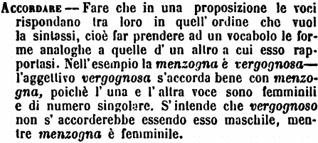 | Accordare - Fare che in una proposizione le voci rispondano tra loro in quell'ordine che vuol la sintassi, cioè far prendere ad un vocabolo la forme analoghe a quelle d'un altro a cui esso rapportasi. Nell'esempio la menzogna è vergognosa - l'aggettivo vergognosa s'accorda bene con menzogna, poichè l'una e l'altra voce sono femminili e di numero singolare. S'intende che vergognoso non s'accorderebbe essendo esso maschile, mentre menzogna è femminile. [immagine] |