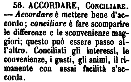 | Accordare, Conciliare - Accordare è mettere bene d'accordo; conciliare è fare scomparire le differenze e le sconvenienze maggiori; questo può essere passo all'altro. Conciliati gli interessi, le convenienze, i gusti, gli animi, il rimanente con assai facilità s'accorda. [immagine] |