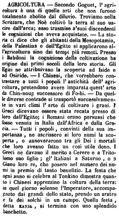 | Agricoltura - Secondo Gouet, l'agricoltura è una di quelle arti che non furono totalmente abolite dal diluvio. Troviamo nella Scrittura, che Noè coltivò la terra al suo uscire dall'arca; esso trasmise a' suoi discendenti le cognizioni che aveva acquistate. - La storia ci dice che gli abitanti della Mesopotamia, della Palestina e dell'Egitto si applicarono all'agricoltura sino dai tempi più remoti. Presso i Babiloni la cognizione della coltivazione ha origine dai primi secoli della loro storia. Gli Egizi ne attribuivano la scoperta ad Iside e ad Osiride. - I Chinesi, che vorrebbero contrastare a tutti popoli l'antichità dell'agricltura, pretendono avere imparata quest'arte da Chin-noug successore di Fo-hi. - Da quelle diverse contrade si trasportò successivamente in vari climi l'arte di coltivare i grani. I Greci dicevano essere stata recata presso di loro dall'Egitto; i Romani erano persuasi che fosse venuta in Italia dall'Africa e dalla Grecia. - Tutti i popoli, convinti della sua importanza, ne ascrissero ai loro numi la scoperta, o annoverarono tra gli Dei i mortali che loro aveano fatto un così utile dono. I Greci ne davano il merito a Cerere e a Tritolemo suo figlio; gl'Italiani a Saturno, o a Giano loro re, che posero nel numero dei numi in premio di tanto benefizio. La festa che ogni anno si celebra al Tonkino dimostra quanto i Chinesi apprezzino la coltura della terra: in quel giorno solenne l'Imperatore, accompagnato dai grandi dello stato, prende un aratro e fa dei solchi in un campo. Quella festa, detta kanja, si termina con uno splendido banchetto. [immagine] |
