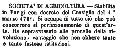 | Società di agricoltura - Stabilita in Parigi con decreto del Consiglio del 1.° marzo 1761. Si occupa di tutto ciò che può concorrere al perfezionamento di quest'arte. Ha sopravissuto alle procelle della rivoluzione: vantaggio che non ebbero tante e tante fastose istituzioni. [immagine] |
