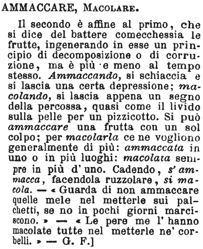 | Ammaccare, Macolare - Il secondo è affine al primo, che si dice del battere comecchessia le frutte, ingenerando in esse un principio di decomposizione o di corruzione, ma è più e meno al tempo stesso. Ammaccando, si schiaccia e si lascia una certa depressione; macolando, si lascia appena un segno della percossa, quasi come il livido sulla pelle per un pizzicotto. Si può ammaccare una frutta con un sol colpo; per macolarla ce ne vogliono generalmente di più: ammaccata in uno o in più luoghi: macolata sempre in più d'uno. Cadendo, s'ammacca, facendola ruzzolare, si macola. - «Guarda di non ammaccare quelle mele nel metterle sui palchetti, se no in pochi giorni marciscono.» - «Le pere me l'hanno macolate tutte nel metterle ne' corbelli.» - G.F.] [immagine] |