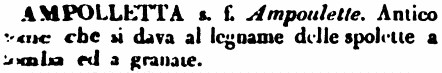 | Ampolletta - s. f. Ampoulette. Antico nome che si dava al legname delle spolette a bomba ed a granate. [immagine] |