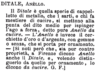 Ditale, Anello - Il Ditale è quella specie di cappelletto di metallo, che i sarti, e chi fa mestiere di cucire, si mettono alla punta del dito medio per ispinger l'ago a forza, detto pure Anello da cucire. - L'Anello è invece il cerchietto d'oro o d'argento, con gemme o senza, che si porta per ornamento. - [Si noti però che, sia pur contro proprietà, a Firenze dicono Anello anche il Ditale, e, volendo distinguerlo da quello per ornamento, lo dicono da cucire. G. F.] [immagine]