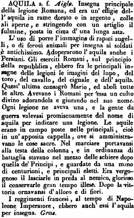 | Aquila - s. f. Aigle. Insegna principale della legione Romana, ed era un'effige dell'aquila in rame dorato o in argento, colle ali aperte, e stringendo con un artiglio il fulmine, posta in cima d'una lunga asta.