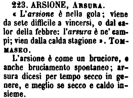 | Arsione, Arsura - «L'arsione è nella gola; viene da sete difficile a vincersi, o dal salor della febbre: l'arsura è ne' campi; vien dalla calda stagione». Tommaseo.