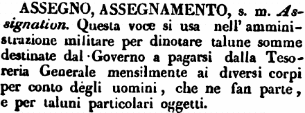 Assegno, Assegnamento - s. m. Assignation. Questa voce si usa nell'amministrazione militare per dinotare talune somme destinate dal Governo a pagarsi dalla Tesoreria Generale mensilmente ai diversi corpi per conto degli uomini, che ne fan parte, e per taluni particolari oggetti. [immagine]