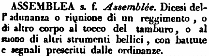 | Assemblea - s. f. Assemblée. Dicesi dell'adunanza o riunione di un reggimento, o di altro corpo al tocco del tamburo, o al suono di altri strumenti bellici, con battute e segnali prescritti dalle ordinanze. [immagine] |
