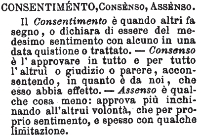 Consentimento, Consenso, Assenso - Il Consentimento è quando altri fa segno, o dichiara di essere del medesimo sentimento con alcuno in una data quistione o trattato. - Consenso è l'approvare in tutto e per tutto l'altrui o giudizio o parere, acconsentendo, in quanto è da noi, che esso abbia effetto. - Assenso è qualche cosa meno: approva più inchinando all'altrui volontà, che per proprio sentimento, e spesso con qualche limitazione. [immagine]