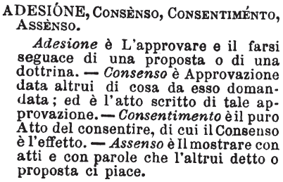 Adesione, Consenso, Consentimento, Assenso - Adesione è L'approvare e il farsi seguace di una proposta o di una dottrina. - Consenso è Approvazione data altrui di cosa da esso domandata; ed è l'atto scritto di tale approvazione. - Consentimento è il puro Atto del consentire, di cui il Consenso è l'effetto. - Assenso è il mostrare con atti e con parole che l'altrui detto o proposta ci piace. [immagine]