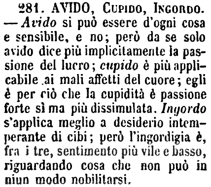 Avido, Cupido, Ingordo - Avido si può essere d'ogni cosa e sensibile, e no; però da se solo avido dice più implicitamente la passione del lucro; cupido è più applicabile ai mali affetti del cuore; egli è per ciò che la cupidità è passione forte sì ma più dissimulata. Ingordo s'applica meglio a desiderio intemperante di cibi; però l'ingordigia è, fra i tre, sentimento più vile e basso, riguardando cosa che non può in niun modo nobilitarsi. [immagine]