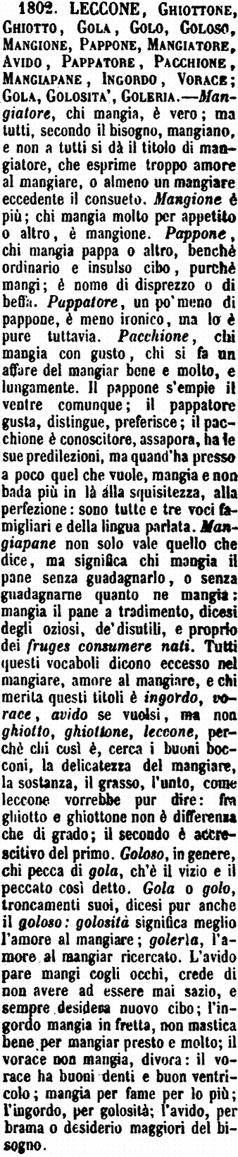 Leccone, Ghiottone, Ghiotto, Gola, Golo, Goloso, Mangione, Pappone, Mangiatore, Avido, Pappatore, Pacchione, Mangiapane, Ingordo, Vorace; Gola, Golosità, Goleria - Mangiatore, chi mangia, è vero; ma tutti, secondo il bisogno, mangiano, e non a tutti si dà il titolo di mangiatore, che esprime troppo amore al mangiare, o almeno un mangiare eccedente il consueto. Mangione è più; chi mangia molto per appetito o altro, è mangione. Pappone, chi mangia pappa o altro, benchè ordinario e insulso cibo, purchè mangi; è nome di disprezzo o di beffa. Pappatore, un po’ meno di pappone, è meno ironico, ma lo è pure tuttavia. Pacchione, chi mangia con gusto, chi si fa un affare del mangiar bene e molto, e lungamente. Il pappone s’empie il ventre comunque; il pappatore gusta, distingue, preferisce; il pacchione è conoscitore, assapora, ha le sue predilezioni, ma quand’ha presso a poco quel che vuole, mangia e non bada più in là alla squisitezza, alla perfezione: sono tutte e tre voci famigliari e della lingua parlata. Mangiapane non solo vale quello che dice, ma significa chi mangia il pane senza guadagnarlo, o senza guadagnarne quanto ne mangia: mangia il pane a tradimento, dicesi degli oziosi, de’ disutili, e proprio dei fruges consumere nati. Tutti questi vocaboli dicono eccesso nel mangiare, amore al mangiare, e chi merita questi titoli è ingordo, vorace, avido se vuolsi, ma non ghiotto, ghiottone, leccone, perchè chi così è, cerca i buoni bocconi, la delicatezza del mangiare, la sostanza, il grasso, l’unto, come leccone vorrebbe pur dire: fra ghiotto e ghiottone non è differenza che di grado; il secondo è accrescitivo del primo. Goloso, in genere, chi pecca di gola, ch’è il vizio e il peccato così detto. Gola o golo, troncamenti suoi, dicesi pur anche il goloso: golosità significa meglio l’amore al mangiare; goleria, l’amore al mangiar ricercato. L’avido pare mangi cogli occhi, crede di non avere ad essere mai sazio, e sempre desidera nuovo cibo; l’ingordo mangia in fretta, non mastica bene per mangiar presto e molto; il vorace non mangia, divora: il vorace ha buoni denti e buon ventricolo; mangia per fame per lo più; l’ingordo, per golosità; l’avido, per brama o desiderio maggiori del bisogno. [immagine]