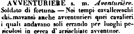 | Avventuriere - s. m. Aventurière. Soldato di fortuna. - Nei tempi cavallereschi chiamavansi anche avventurieri quei cavalieri i quali andavano soli errando per luoghi pericolosi in cerca d'arrischiate avventure. [immagine] |