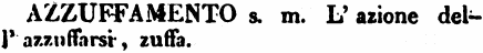 | Azzuffamento - S. m. Da AZZUFFARE. L'azzuffarsi, Zuffa, Baruffa. Lib. Masc. (C) Per evitare tutti i consueti azzuffamenti che nascono tra questi cavalli. Cecch. Esalt. Cr. 3. 7. L'astuto e sgraziato, Che si fidò su' loro azzuffamenti, Vi lasciò 'l cuojo. |