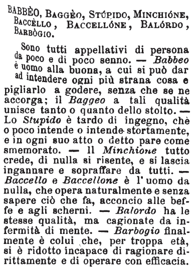 | Babbeo, Baggeo, Stupido, Minchione, Baccello, Baccellone, Balordo, Barbogio - Sono tutti appellativi di persona da poco e di poco senno. - Babbeo è uomo alla buona, a cui si può dar ad intendere ogni più strana cosa e pigliarlo a godere, senza che se ne accorga; il Baggeo a tali qualità unisce tanto o quanto dello stolto. - Lo Stupido è tardo di ingegno, che o poco intende o intende stortamente, e in ogni suo atto o detto pare come smemorato. - Il Minchione tutto crede, di nulla si risente, e si lascia ingannare e sopraffare da tutti. - Baccello e Baccellone è l'uomo da nulla, che opera naturalmente e senza sapere ciò che fa, acconcio alle beffe e agli scherni. - Balordo ha le stesse qualità, ma cagionate da infermità di mente. - Barbogio finalmente è colui che, per troppa età, si è ridotto incapace di ragionare dirittamente e di operare con efficacia. [immagine] |