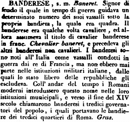 | Banderese - s. m. Baneret. Signor di feudo il quale in tempo di guerra guidava un determinato numero dei suoi vassalli sotto la propria bandiera, la quale era quadra. Il banderese era qualche volta cavaliere, ed allora assumeva il titolo di cavalier banderese in franc. Chevalier baneret, e precedeva gli altri banderesi non cavalieri. I banderesi sono noti all'Italia come vassalli condotti in guerra dai re di Francia, ma non ebbero mai parte nelle istituzioni militari italiane, dalle quali lo stato libero delle repubbliche gli escludeva. Coll'andar del tempo i Romani moderni introdussero questo nome nelle loro istituzioni municipali, e verso il fine del XIV secolo chiamarono banderesi i tredici governatori del popolo, i quali portavano le bandiere dei tredici quartieri di Roma. Gras. [immagine] |