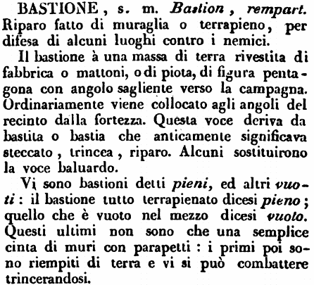 | Bastione - s. m. Bastion, rempart. Riparo fatto di muraglia o terrapieno, per difesa di alcuni luoghi contro i nemici.