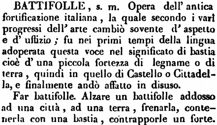 Battifolle - s. m. Opera dell'antica fortificazione italiana, la quale secondo i vari progressi dell'arte cambiò sovente d'aspetto e d'uffizio; fu nei primi tempi della lingua adoperata questa voce nel significato di bastia cioè d'una piccola fortezza di legname o di terra, quindi in quello di Castello o Cittadella, e finalmente andò affatto in disuso.