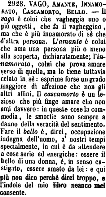 | Vago, Amante, Innamorato, Cascamorto, Bello - Il vago è colui che vagheggia uno o più oggetti, che fa il vagheggino, ma che è più innamorato di sè che d'altra persona. L'amante è colui che ama una persona più o meno alla scoperta, dichiaratamente; l'innamorato, colui che prova amore verso di quella, ma lo tiene tuttavia celato in sè: esprime forse un grado maggiore di affezione che non gli altri affini. Il cascamorto è un lezioso che più finge amare che non ami davvero: in queste cose la commedia, le smorfie sono sempre a danno della veracità del sentimento. Fare il bello è, direi, occupazione indegna dell'uomo, a' nostri tempi specialmente, in cui è da attendere a cose serie ed energiche: essere il bello di una donna, è, in senso castigato, essere amato da lei: e qui più non dico perchè direi troppo, e l'indole del mio libro neanco mel consente. [immagine] |