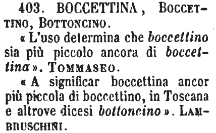 Boccettina, Boccettino, Bottoncino - « L'uso determina che boccettino sia più piccolo ancora di boccettina ». Tommaseo.